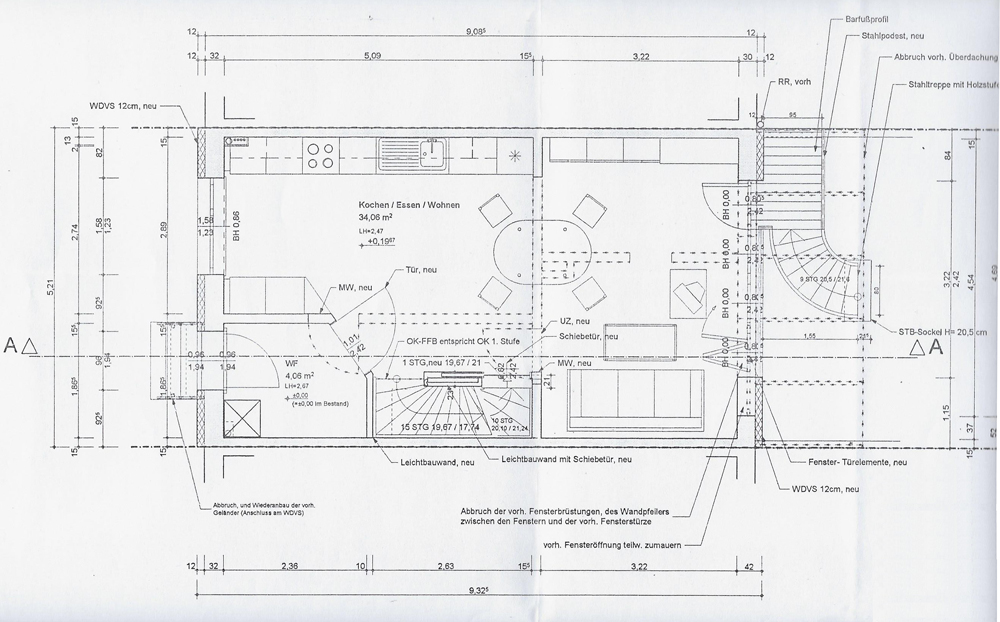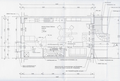 befinden sich der separate Eingangsbereich (Windfang) sowie der großzügige Wohn- und Essbereich (ca. 34 m²) mit offener Küche. Von hier aus gelangt man über eine Metalltreppe in den schönen Garten. Großzügige Fensterelemente sorgen für optimale Lichtverhältnisse.