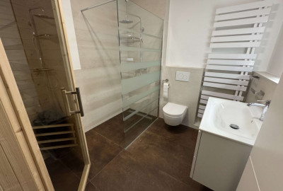 Das stilvolle Badezimmer ist mit einer ebenerdigen Walk-in-Dusche und einer Infrarotsauna ausgestattet; ein separates Gäste-WC ist ebenfalls vorhanden.